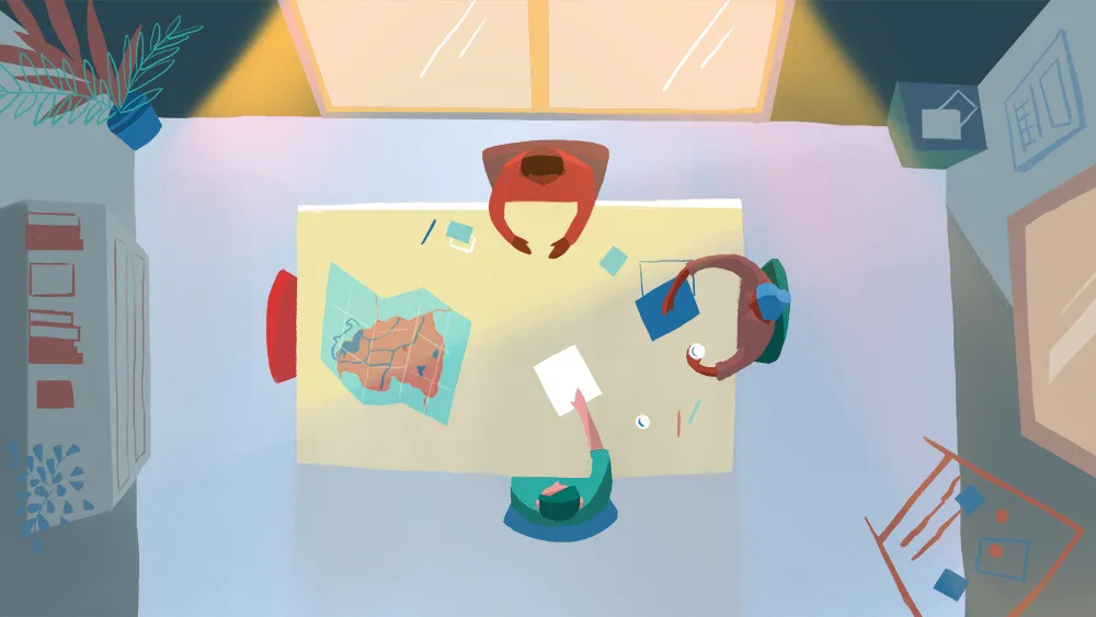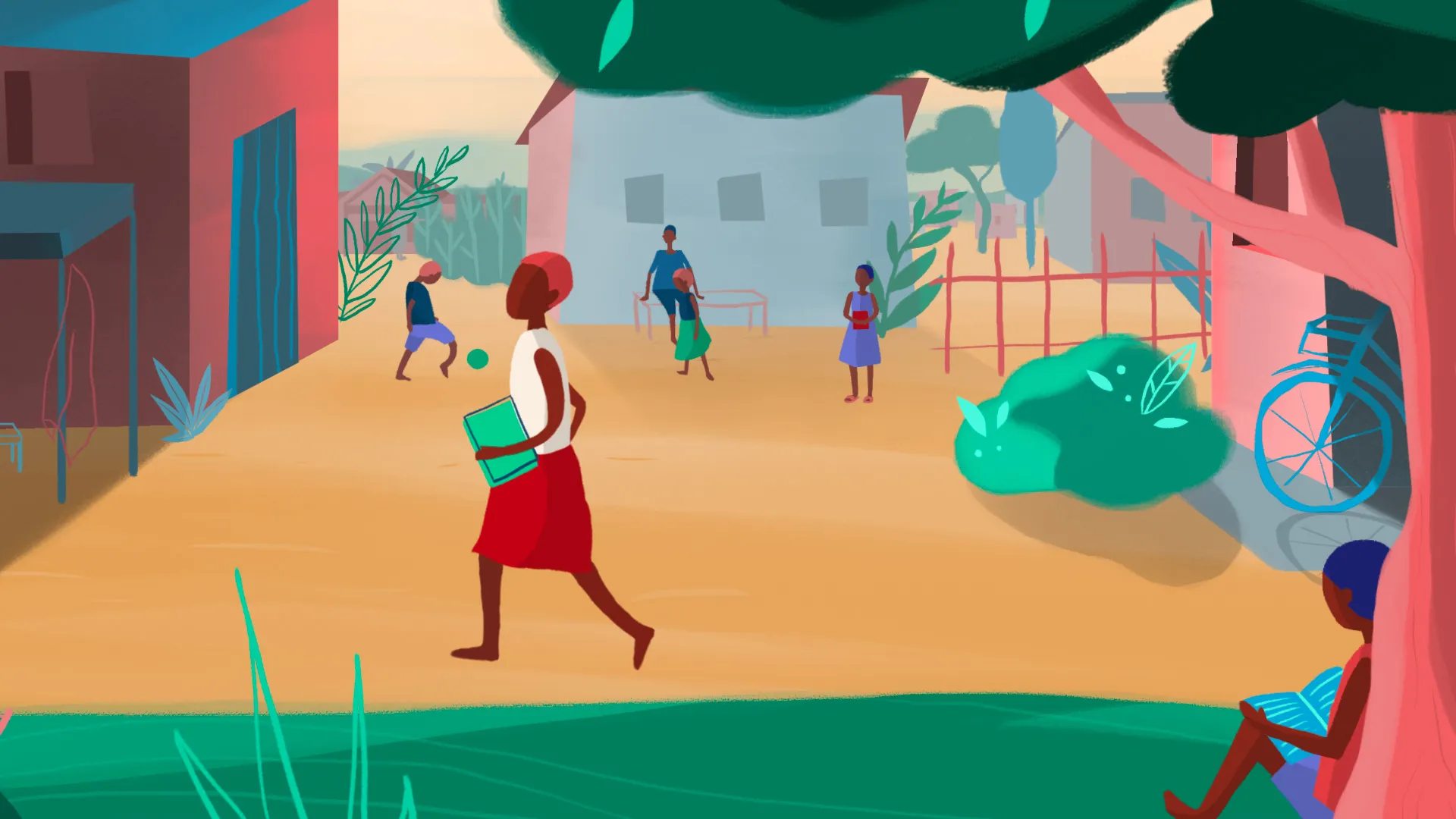 Digital handgezeichnet, mit einem Mix aus pastelligen und stark gesättigten Farben – das war der Look, den wir erzielten. Die warme Farbpalette spiegelt das Klima und die Umwelt in Ruanda wieder.