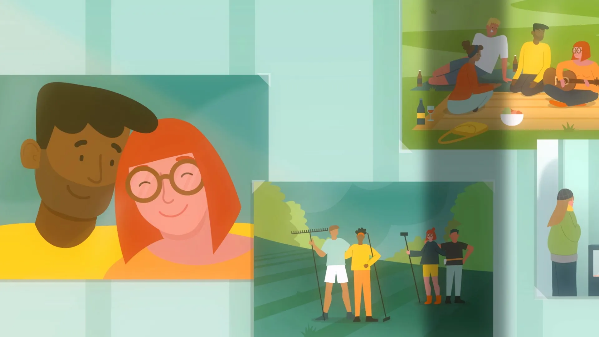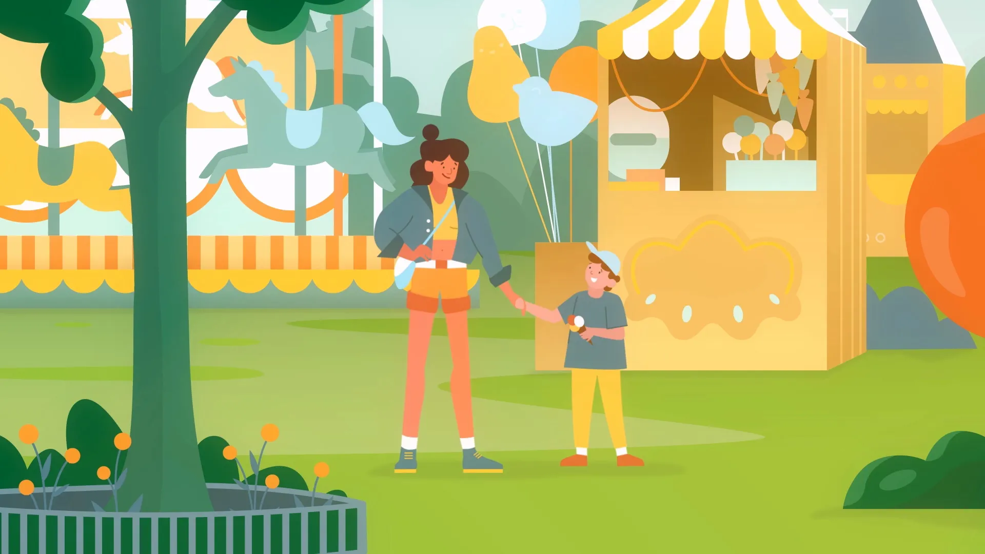 Frohe helle Farben unterstreichen das positive Gefühl, das vermittelt werden soll. Das Charakterdesign muss genügend Details für Mimik und Gestik besitzen um Zufriedenheit und Glück darstellen zu können.